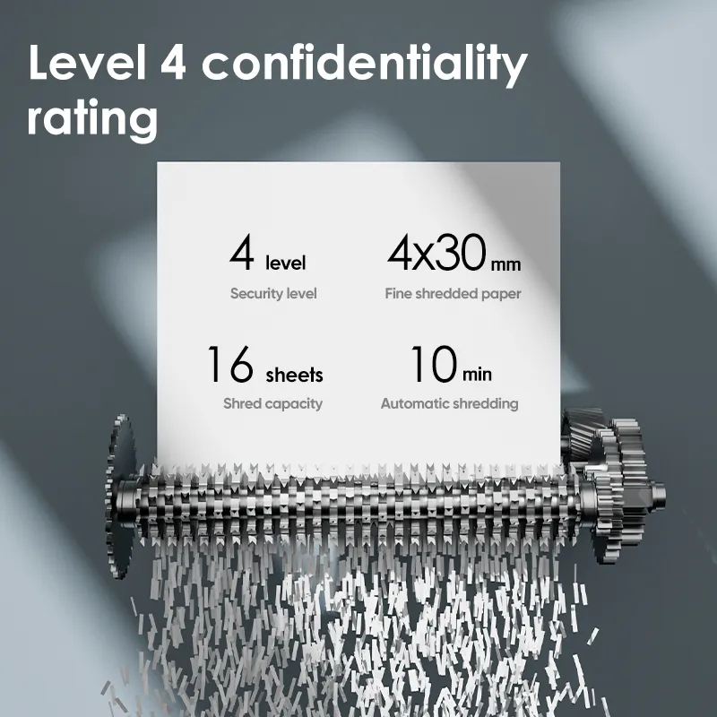 The shredder easily shreds plastic cards and staples, eliminating the need to remove attachments. Its 23-liter waste bin offers ample capacity for extended use before emptying. Additional smart features include an auto reverse function to prevent paper jams and an auto power-off function for enhanced safety and energy efficiency.