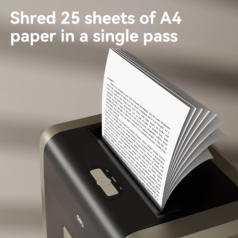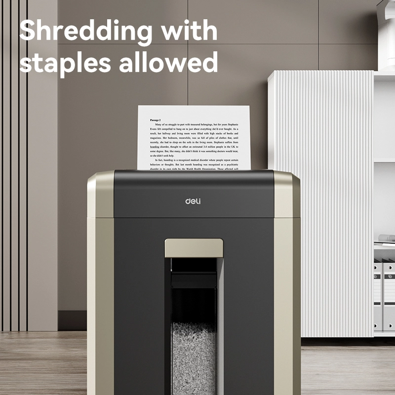 With a 31-liter waste bin, the Deli ET099 minimizes interruptions during long shredding sessions. The Full Bin Alarm conveniently alerts you when the bin needs emptying, and the Auto Reverse Function helps clear jams instantly. The Auto Power Off feature enhances energy efficiency and safety by automatically shutting down the unit when idle.