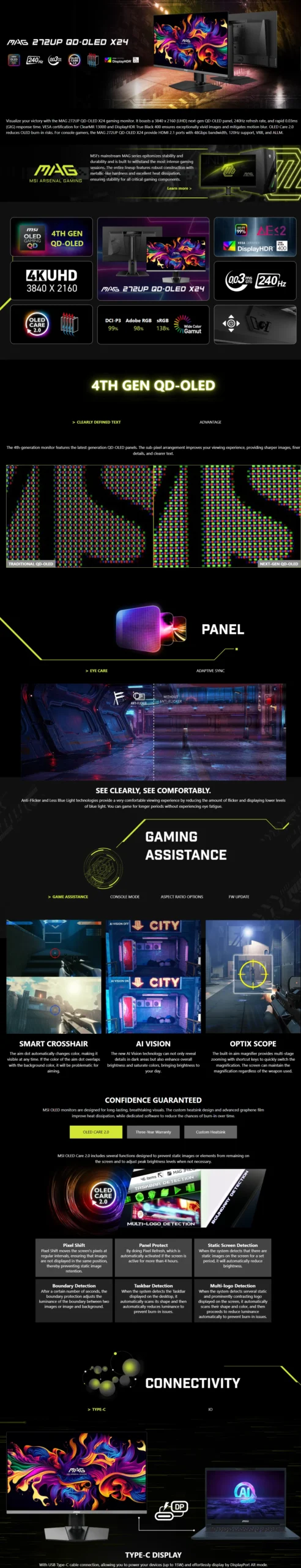 Dominate every game with the MSI MAG 272UP QD-OLED X24, a next-generation 27-inch UHD (3840 × 2160) gaming monitor that pushes performance and visuals to the highest level. Featuring a 4th-gen QD-OLED panel, this monitor delivers breathtaking image quality with true-to-life colors, deep blacks, and unparalleled brightness for immersive gaming and entertainment.