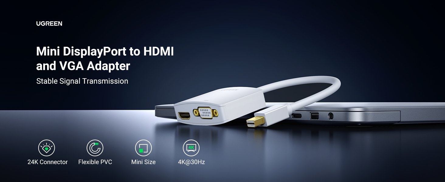 The UGREEN 10427 Mini DisplayPort to HDMI & VGA Adapter is a versatile display solution designed to connect Mini DisplayPort devices to HDMI or VGA displays. It allows you to mirror or extend your screen to a monitor, TV, or projector, making it ideal for presentations, office work, and home entertainment.