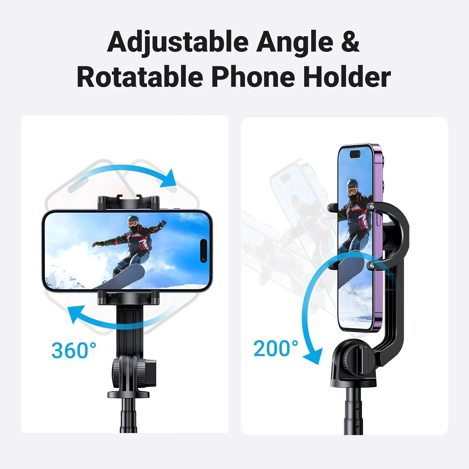 The included detachable Bluetooth remote allows you to take photos and record videos wirelessly from a distance, making it ideal for family pictures, travel shots, TikTok videos, and hands-free content creation. The phone holder features a secure grip with soft silicone pads, keeping your device firmly in place while protecting it from scratches. It rotates 360°, giving you the freedom to switch between portrait and landscape in seconds.