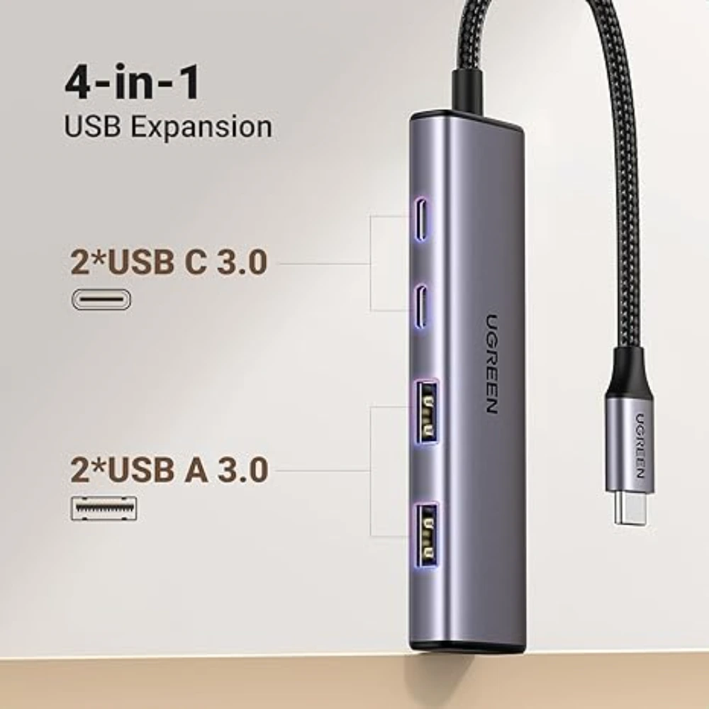 The UGREEN 15395 USB-C Hub 4 Ports USB-C Multiport Adapter is a compact and efficient connectivity solution designed to expand a single USB-C port into multiple high-speed connections. Perfect for modern laptops, tablets, and smartphones, this hub delivers convenience and performance in a sleek, portable design.