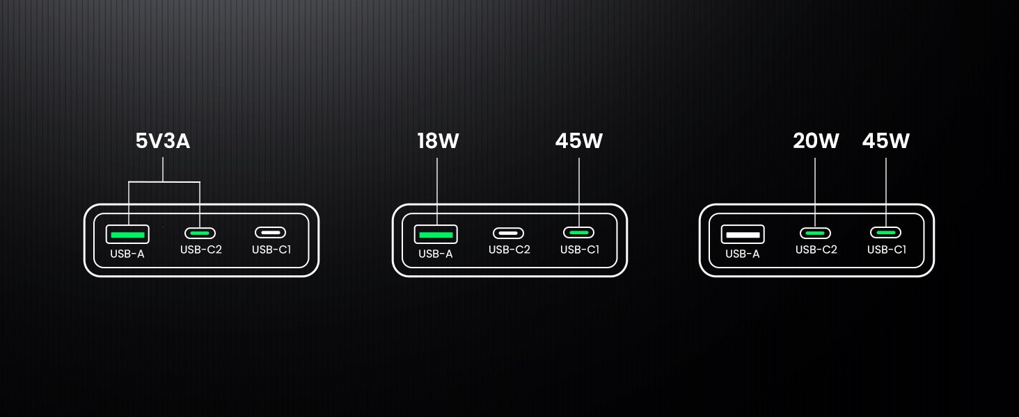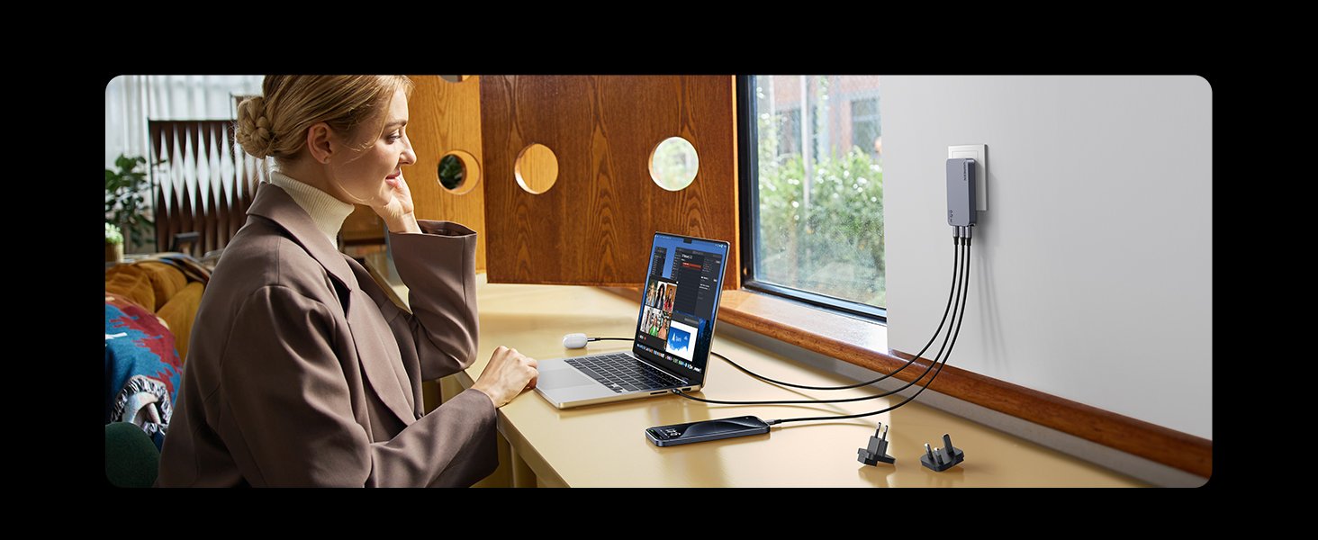 With a total output of up to 65W, this fast charger supports laptops, tablets, smartphones, earbuds, and other USB-powered devices. It features three USB-C ports and one USB-A port, allowing you to charge multiple devices at the same time while the charger intelligently distributes power for optimal performance.