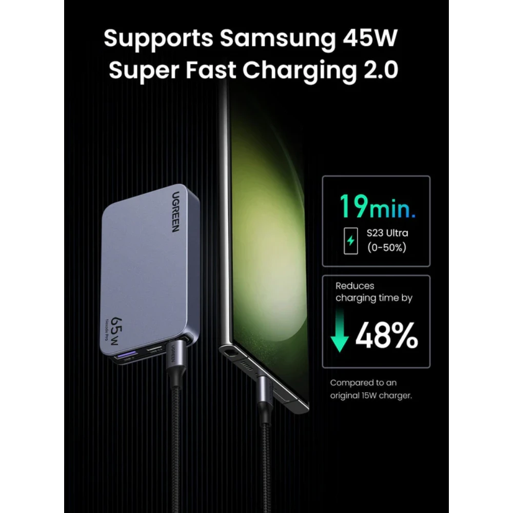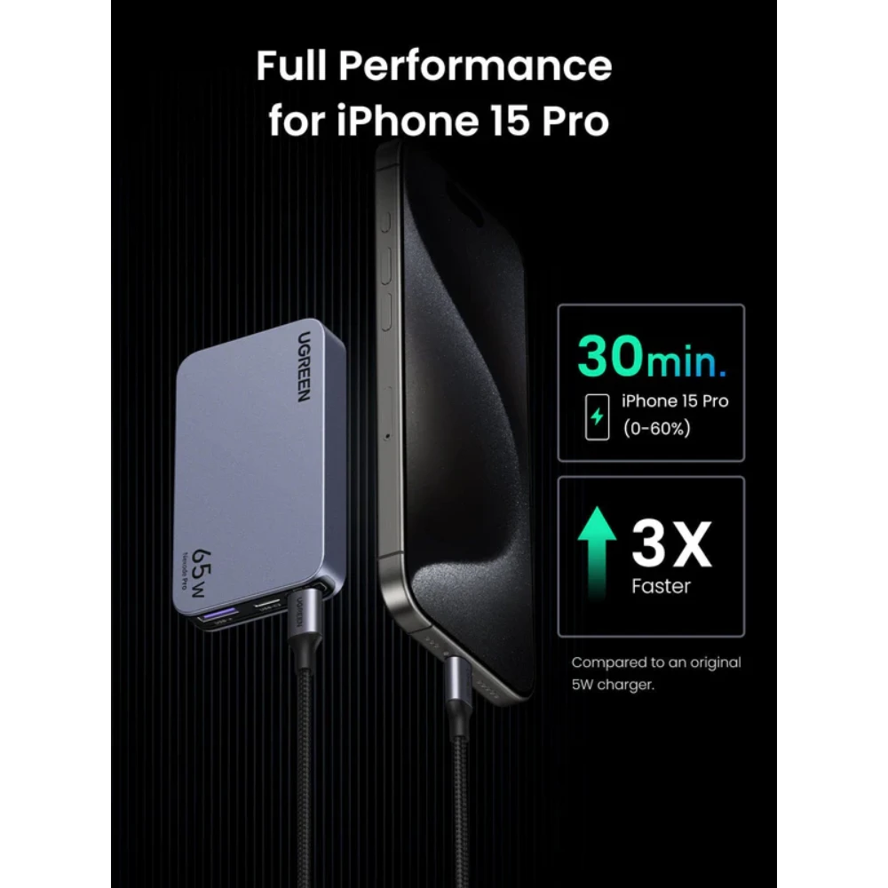 The UGREEN 15816 65W 3-Port GaN Ultra-Thin Fast Charger is designed for users who want powerful charging performance in a slim, space-saving form. Built with advanced GaN (Gallium Nitride) technology, this charger delivers high efficiency, reduced heat, and faster charging while maintaining an ultra-thin and lightweight design.
