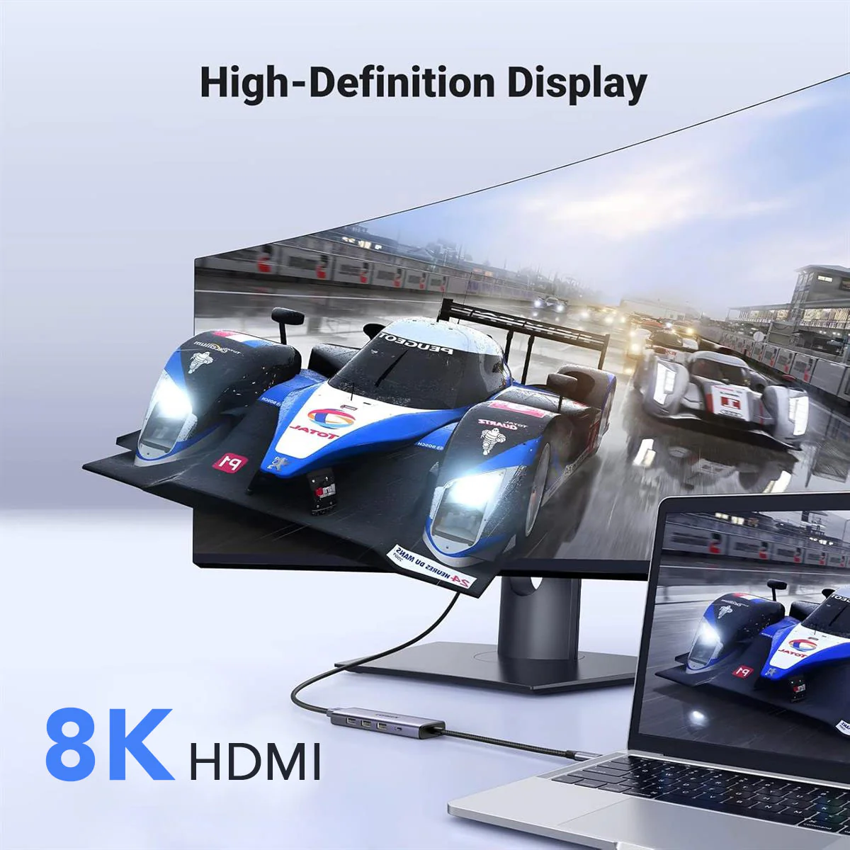 • 5-in-1 USB-C Hub: Expand a single USB-C port into 8K HDMI, 100W PD, and 3x USB-A ports.