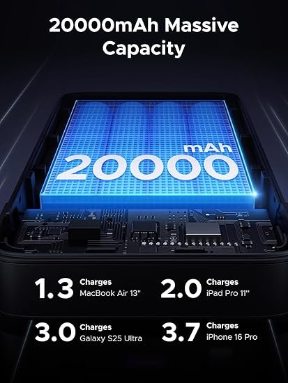 With a massive 20,000mAh battery capacity, you can stay powered for 5–7 days. Fully charge your iPhone 15 Pro up to 4.5 times or your MacBook Air 15” up to 1.1 times, making it ideal for travel, business trips, camping, and outdoor adventures.