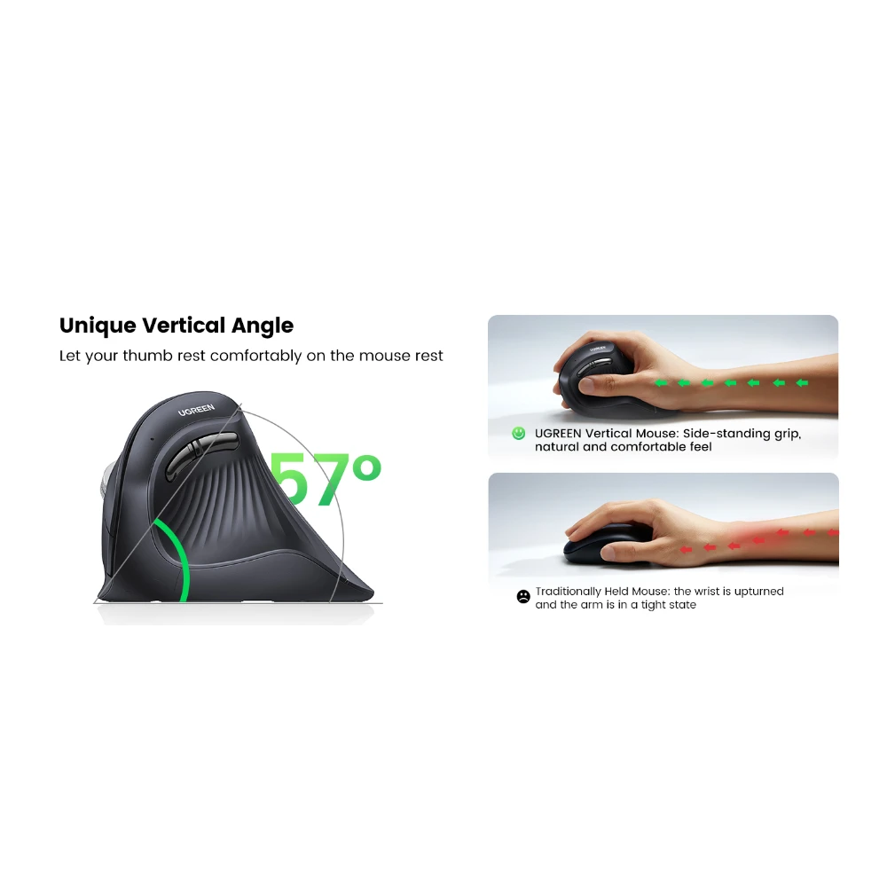 The UGREEN 25444 Ergonomic Vertical Wireless Mouse is designed to provide maximum comfort and reduce wrist strain during long hours of work or study. Its vertical ergonomic design promotes a natural hand position, helping to minimize fatigue and discomfort commonly caused by traditional mice.