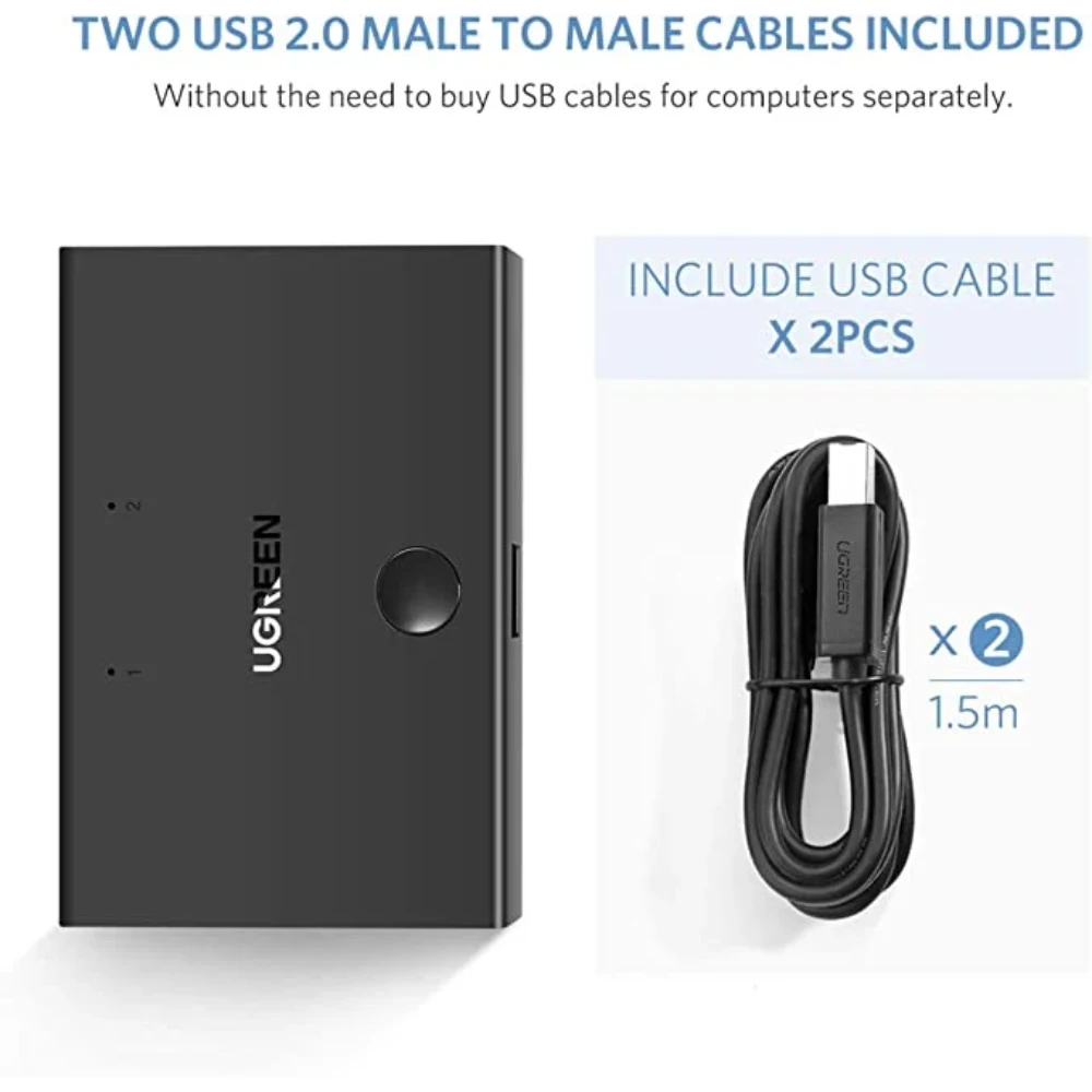 The UGREEN 30345 USB 2.0 Sharing Switch 2 In 1 Out is a convenient solution for sharing a single USB device between two computers. It allows two PCs or laptops to easily switch access to one USB peripheral such as a printer, scanner, mouse, keyboard, USB drive, or camera.