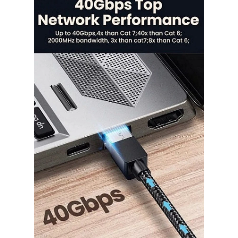 Constructed with 100% pure copper conductors, the cable ensures superior conductivity and minimal signal loss. Built to Category 8 (CAT8) standards, it supports data transfer speeds up to 40Gbps with bandwidth up to 2000MHz, making it ideal for 8K streaming, competitive gaming, cloud computing, NAS systems, servers, and large data transfers.