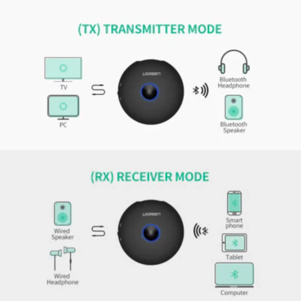 The UGREEN 40762 Bluetooth 4.2 Transmitter / Receiver is a versatile wireless audio solution that allows you to transmit or receive audio via Bluetooth. With its 2-in-1 design, it can easily switch between transmitter (TX) and receiver (RX) modes to suit different audio needs.