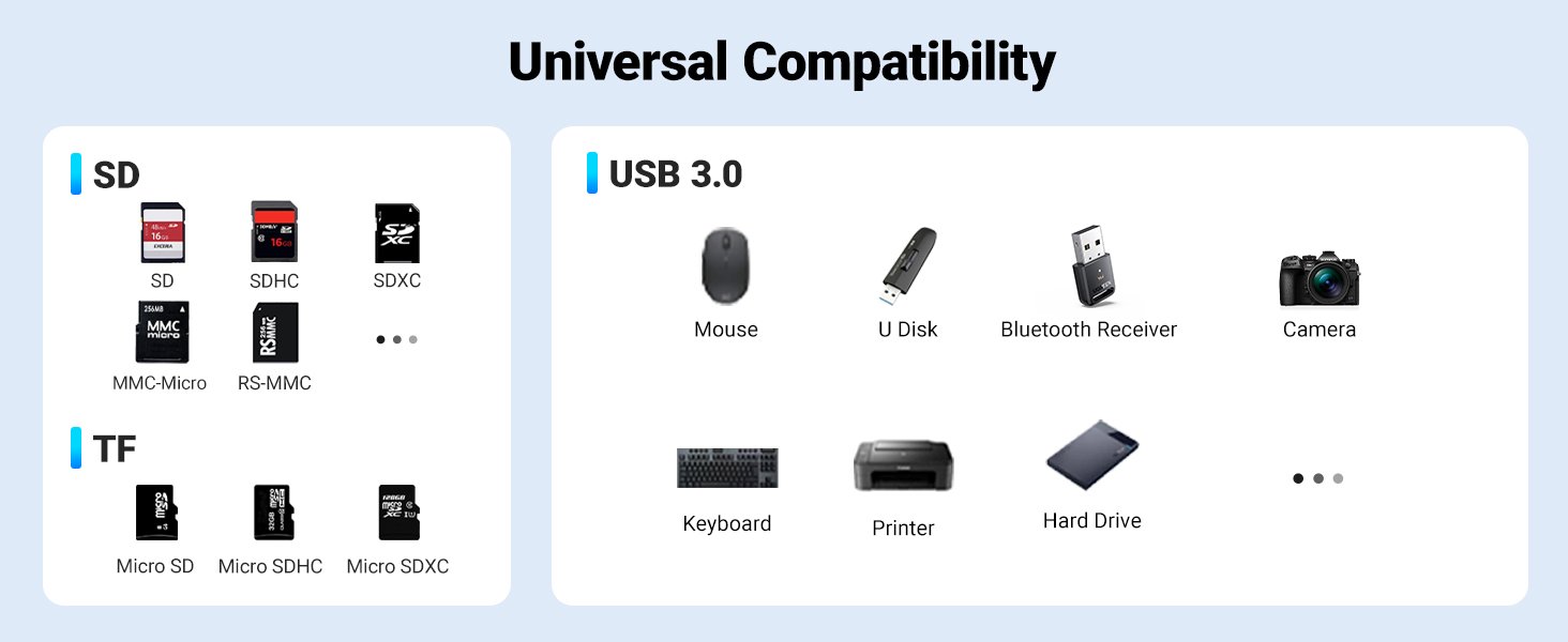With USB 3.0 technology, the hub supports data transfer speeds of up to 5Gbps, enabling fast file transfers from external storage, flash drives, keyboards, mice, and other USB devices. The SD and TF card reader slots allow quick access to photos, videos, and documents, making it ideal for photographers, content creators, and office users.