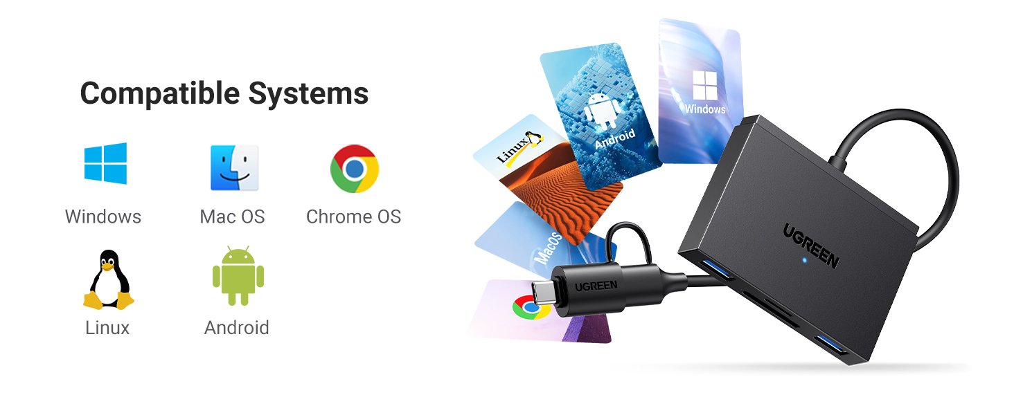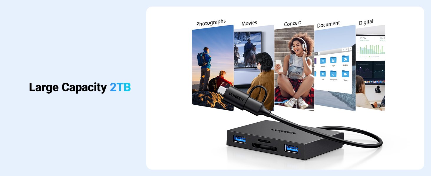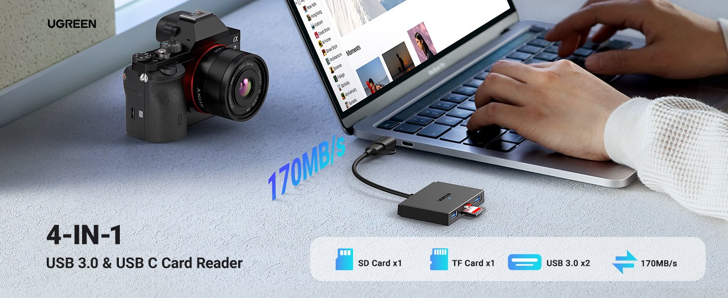 The UGREEN 45167 USB-C 4-in-1 Card Reader is a compact and versatile hub designed to expand your device’s connectivity through a single USB-C port. Combining two USB 3.0 ports with SD and microSD (TF) card slots, it provides a convenient all-in-one solution for data transfer, peripheral connection, and memory card access.