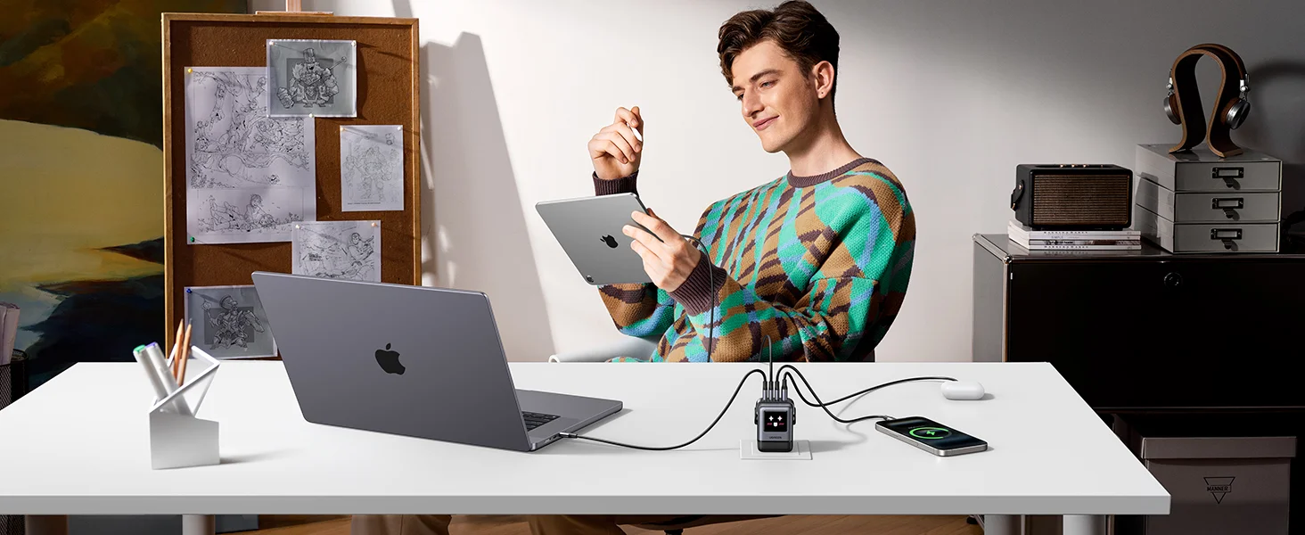 Powered by advanced GaN (Gallium Nitride) technology, the charger delivers higher efficiency, lower heat generation, and a smaller form factor compared to conventional chargers. With a total output of 100W distributed across 4 ports (3× USB-C + 1× USB-A), it can fast-charge laptops, tablets, smartphones, power banks, and other USB-C or USB-A devices simultaneously.