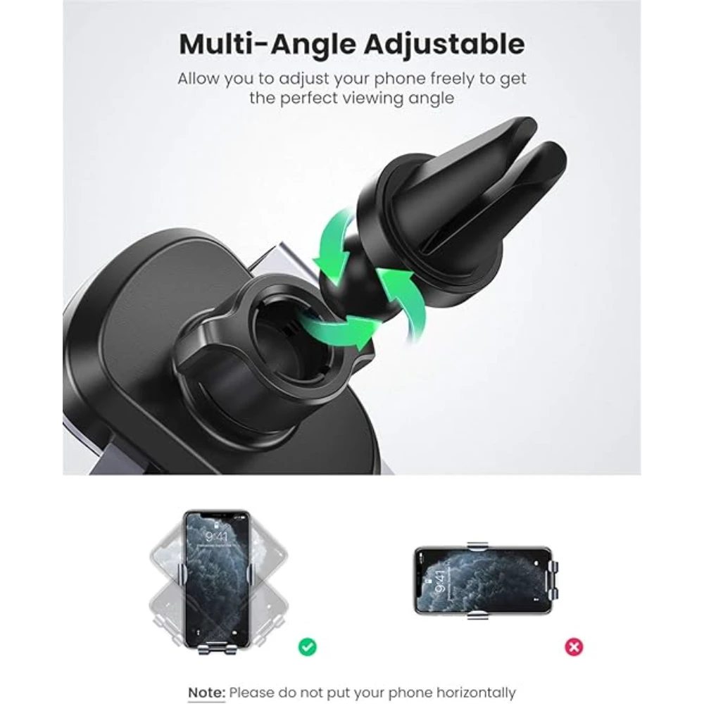 The holder mounts firmly onto your car’s air vent, providing a stable and vibration-free experience even on bumpy roads. Its strong clamp and anti-slip silicone pads protect both your phone and air vent from scratches while ensuring a tight hold. The open design allows easy access to the charging port, making it convenient to charge your phone while navigating or taking calls.