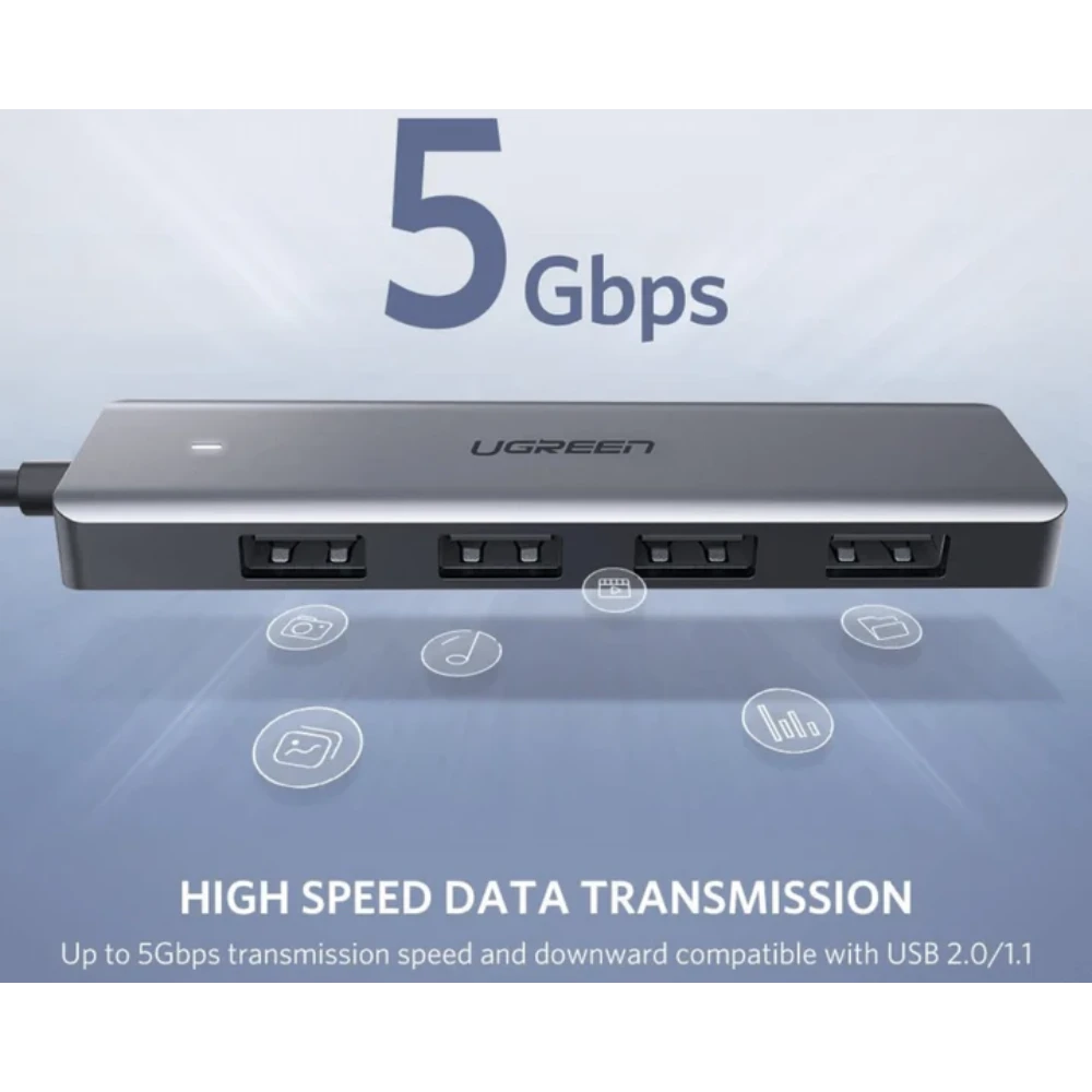 The UGREEN 50985 4-Ports USB 3.0 Hub with USB-C Power Supply is a premium connectivity solution designed to expand your laptop or desktop USB ports while providing stable power to connected devices. With four USB 3.0 ports, this hub allows you to connect multiple peripherals simultaneously, including external hard drives, flash drives, printers, keyboards, mice, and other USB devices, without sacrificing speed or reliability.