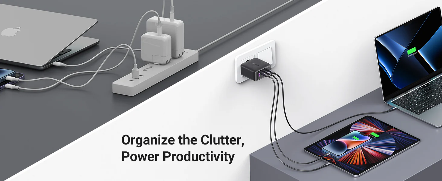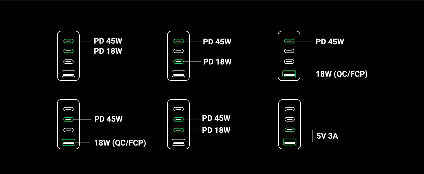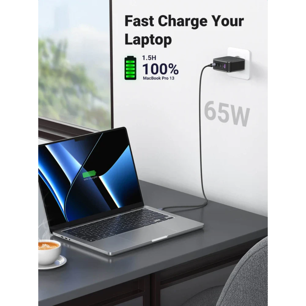 With a maximum output of 65W, it provides Power Delivery (PD) fast charging for laptops, tablets, smartphones, and other USB-C compatible devices. The charger intelligently distributes power to connected devices, ensuring optimal charging speeds without overloading or overheating.