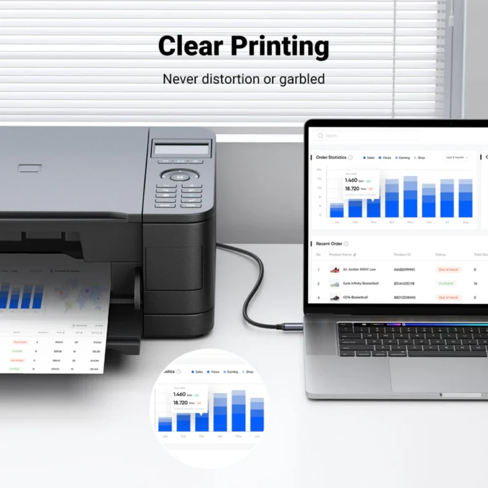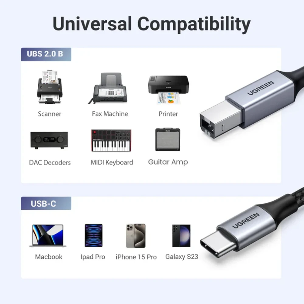 The UGREEN 80805 USB-B to USB-C Printer Cable is designed to provide a fast, stable, and reliable connection between modern USB-C devices and traditional USB-B peripherals. It is ideal for connecting printers, scanners, MIDI controllers, audio interfaces, DACs, and other USB-B devices to laptops, desktops, and tablets equipped with a USB-C port.