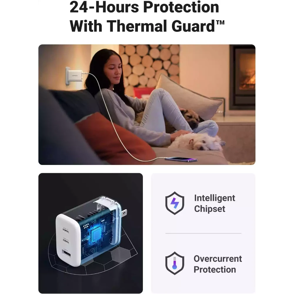 The clean white design with a US plug makes it visually appealing and versatile for any setting. Equipped with multiple safety protections—including over-voltage, over-current, overheating, and short-circuit protection—the UGREEN 90495 guarantees stable and reliable charging every time.