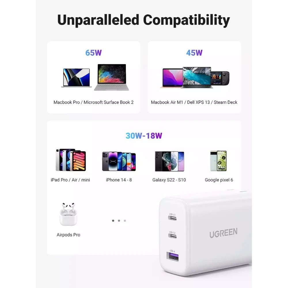 With a total output of up to 65W, it supports fast charging for laptops, tablets, smartphones, and other USB-powered devices. The charger comes with two USB-C ports and one USB-A port, allowing you to charge up to three devices simultaneously. Its intelligent power distribution automatically adjusts the output for each connected device, ensuring optimal performance and safety.