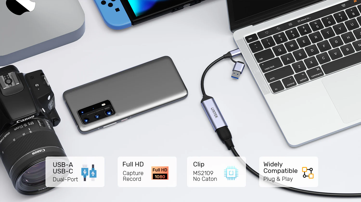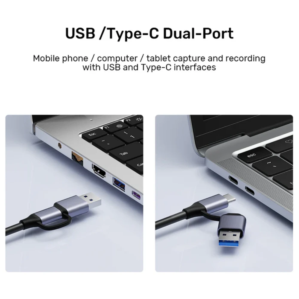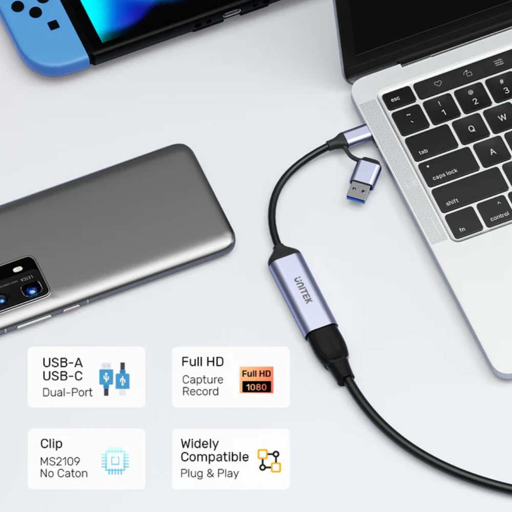 The UNITEK V1167A HDMI to USB-C/A Video Capture Card (4K, 15cm) is a high-performance, plug-and-play capture solution designed for streamers, content creators, videographers, gamers, and professionals who need smooth, high-quality video transmission. Engineered with dual-interface support—USB-C and USB-A—this compact capture card provides exceptional device flexibility, making it compatible with laptops, desktops, tablets, and even select mobile devices.