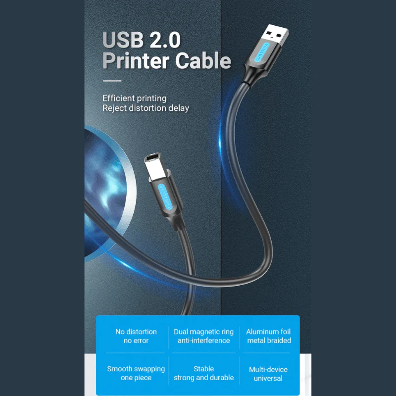The VENTION COQBI USB 2.0 Male to USB Printer Cable 3M Black is a high-quality and dependable cable designed to connect computers, laptops, and USB-enabled devices to printers and scanners. With its extended 3-meter length, it provides flexible placement options for home offices, workplaces, and shared printing environments.